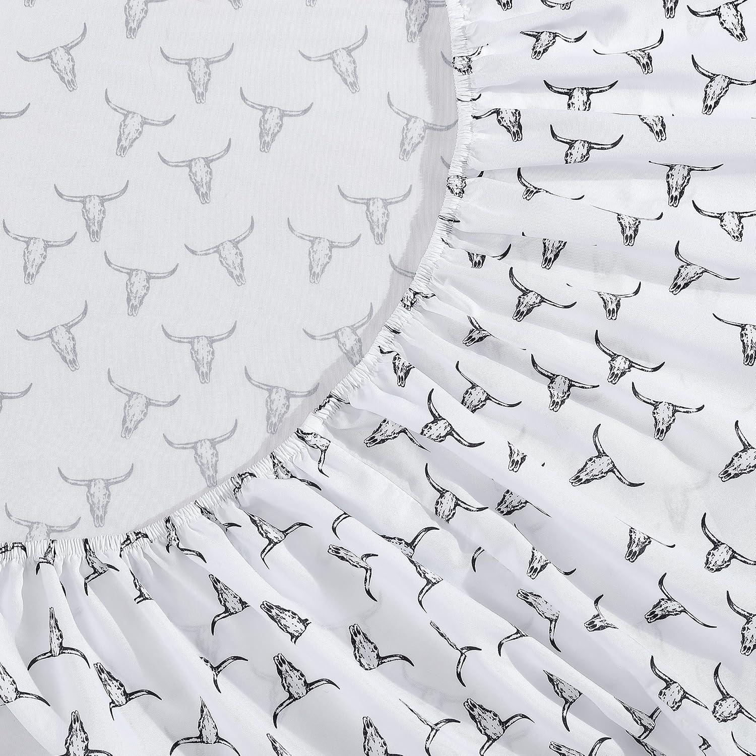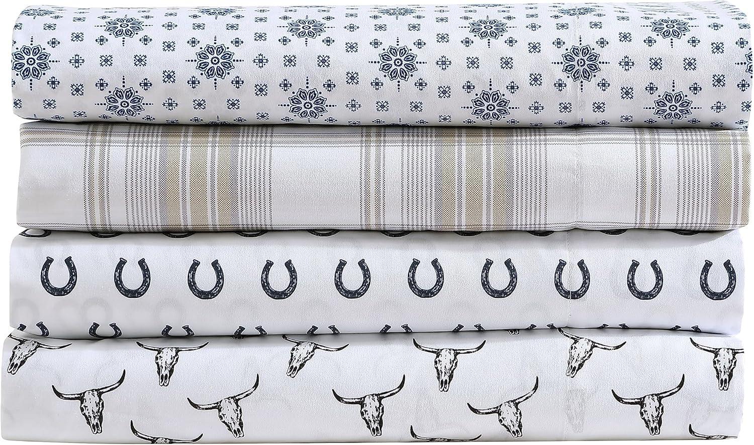 Wrangler – Twin Size Sheet Set, Ultra-Soft & Wrinkle-Resistant Bedding for Year Round Comfort, Deep Pockets, Bed Sheets with Matching Fitted Sheet & Pillowcase (Cowboy Pinstripe Blue)(Steer Skulls Black)