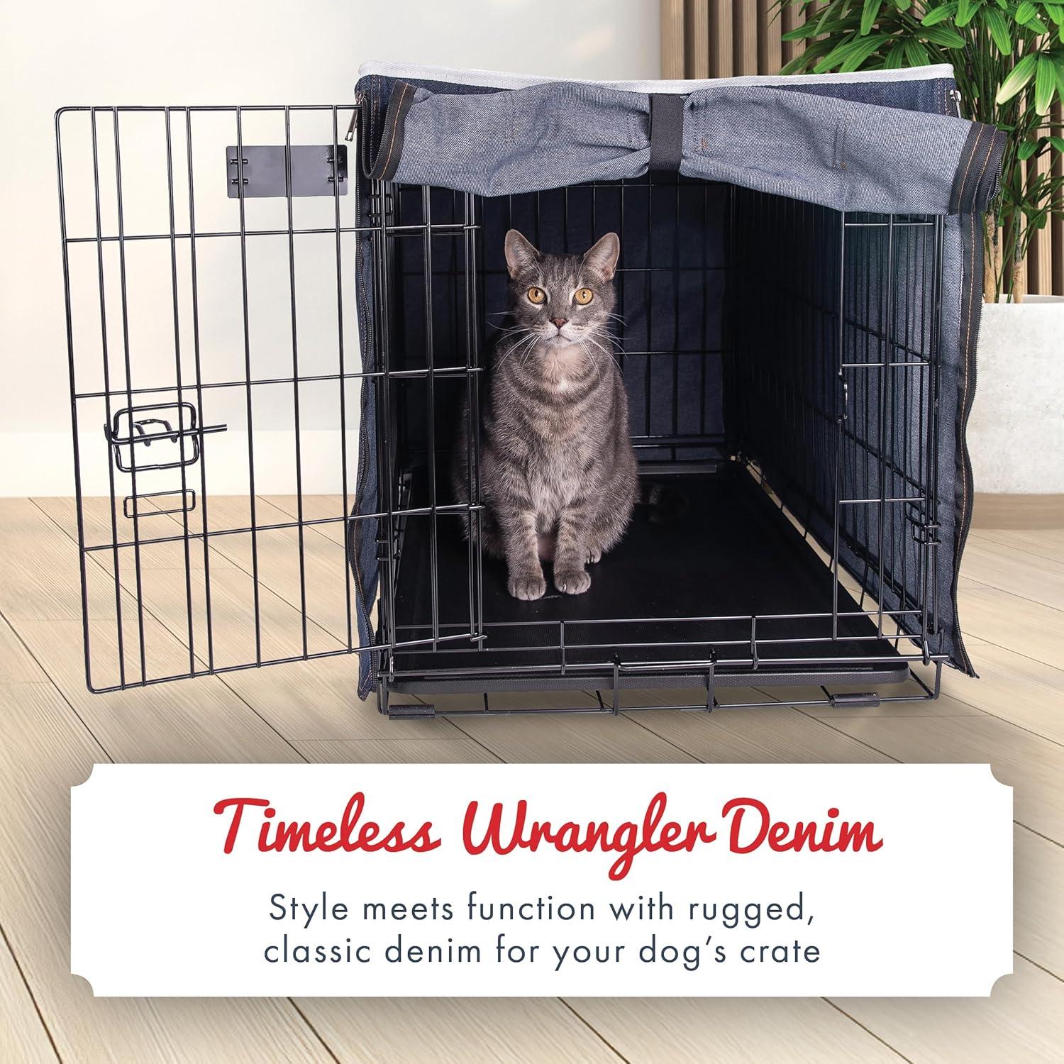 Wrangler Denim Dog Crate Cover – Durable, Breathable & Stylish Dog Kennel Cover with Rollable Panels & Front Pocket for Accesories – Machine Washable Crate Covers for Dog Cages (M)(S)