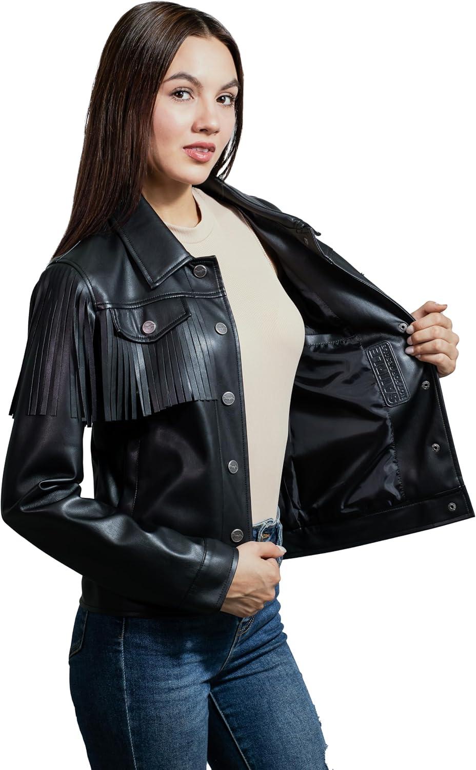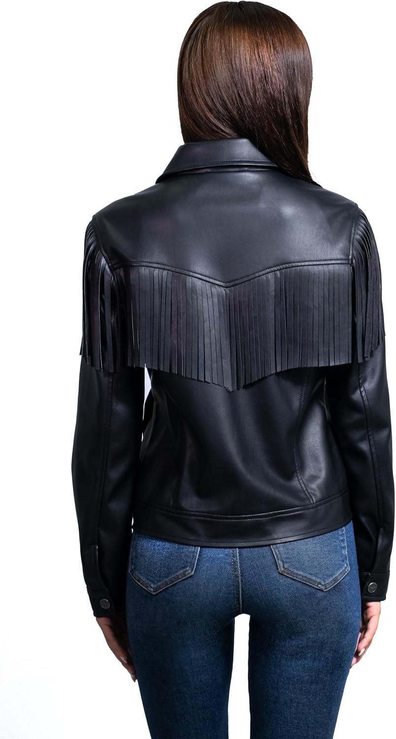 Wrangler Women’s Faux Leather Fringe Trucker Jacket Black.(Black)