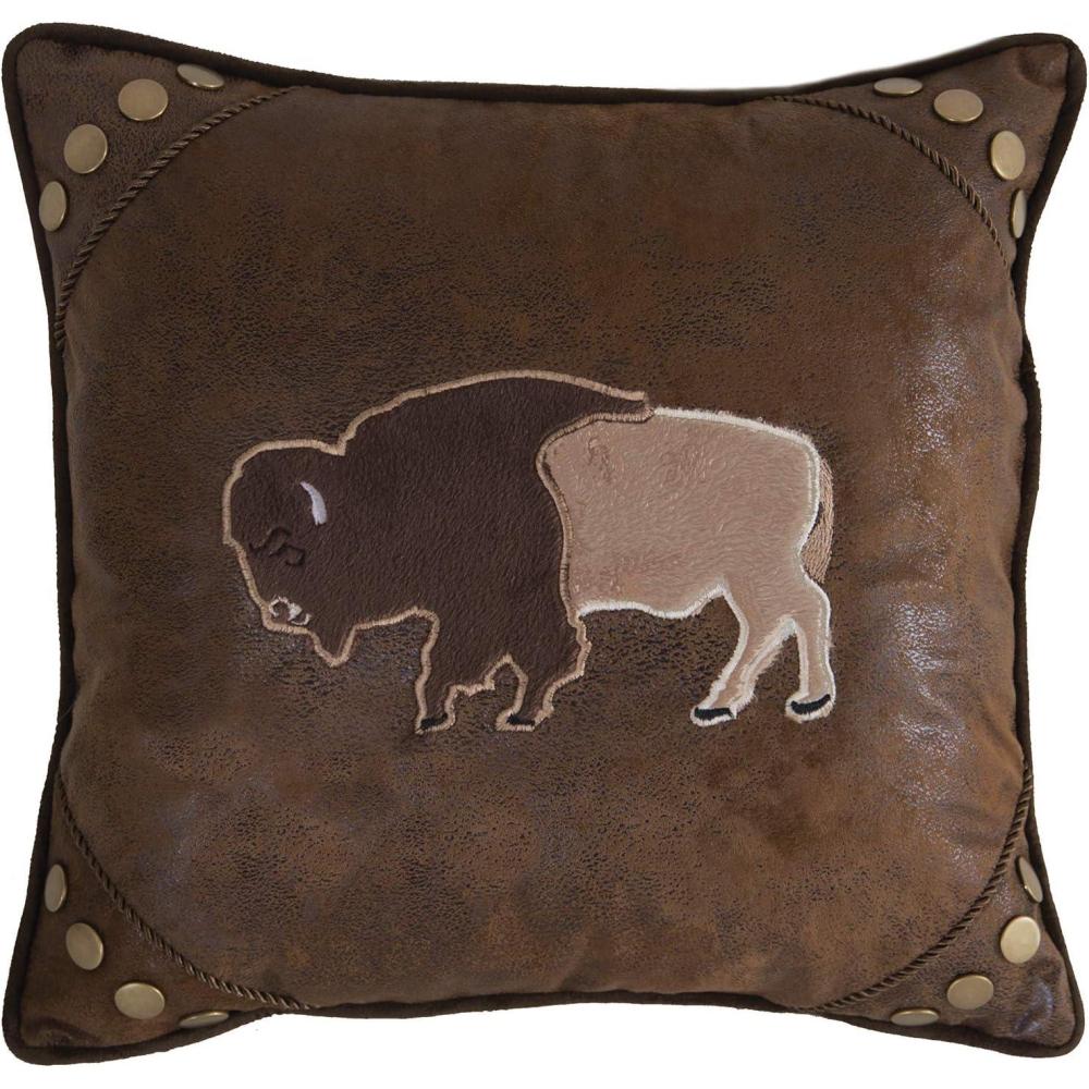 DESIGN: A single embroidered buffalo on a brown faux leather square body with corner rivets. Perfect accent piece for a southwest look.