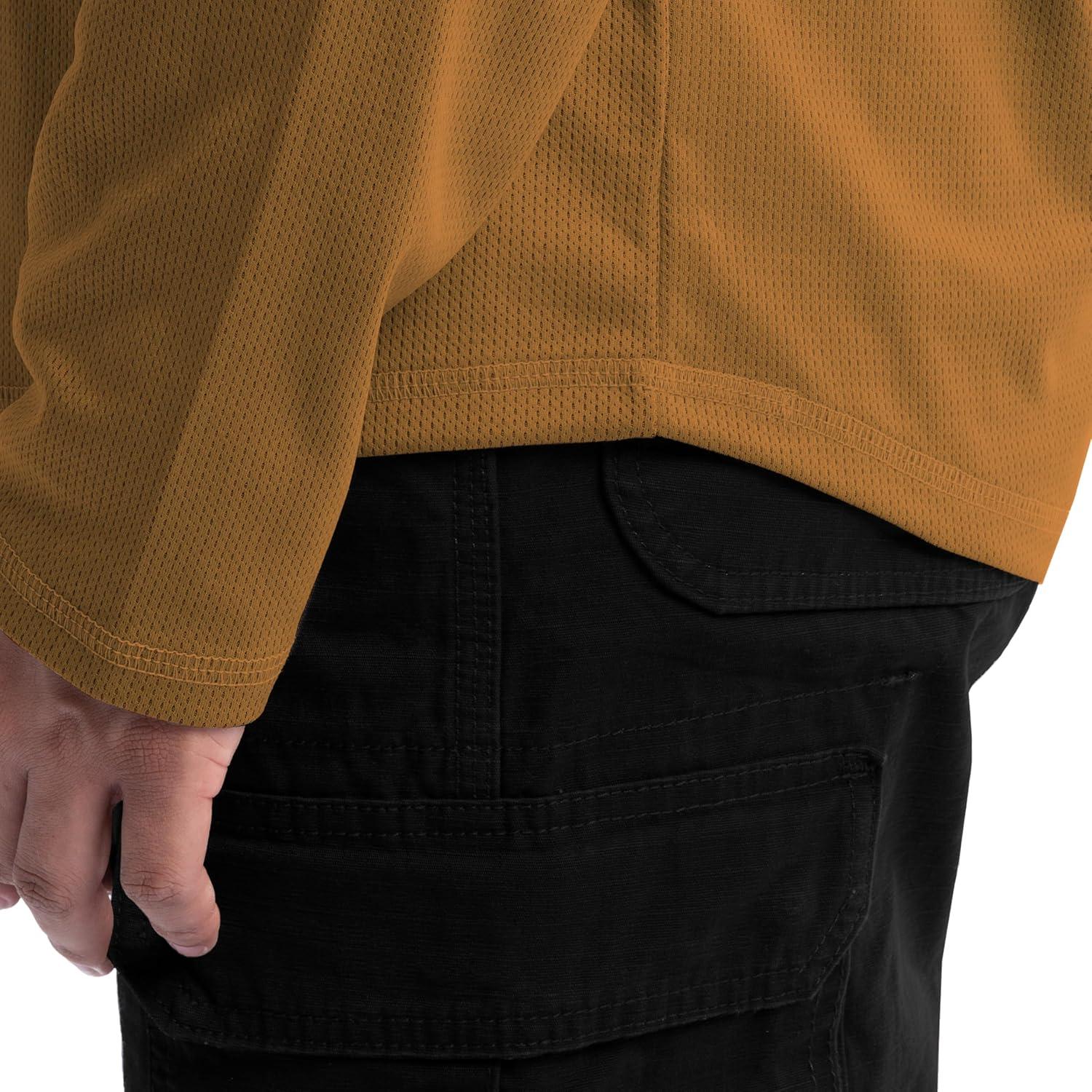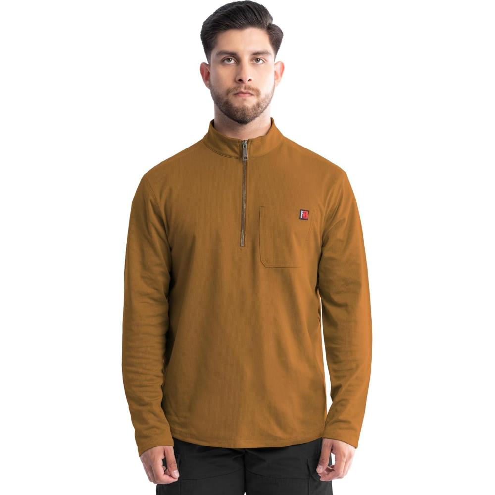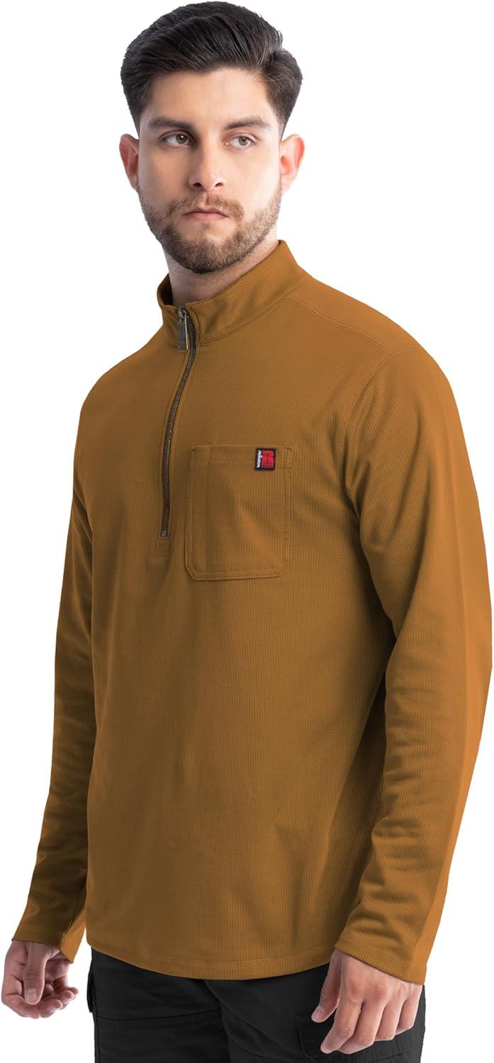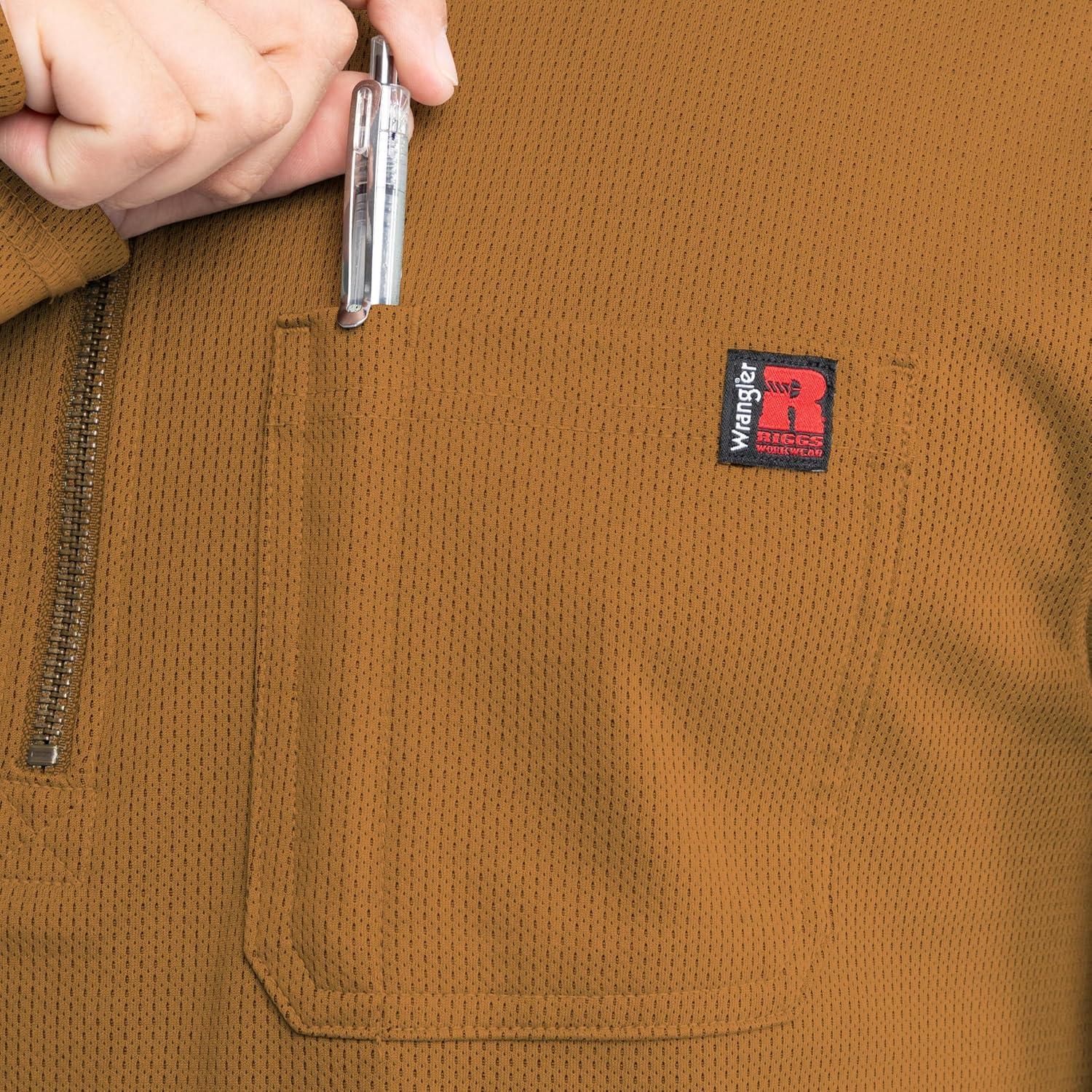 Stay dry, comfortable, and ready for anything in the Wrangler RIGGS Dual Mesh 1/2 Zip Mock Neck Pullover. Designed for hardworking performance, this breathable mid-layer is crafted from durable dual-face mesh fabric—a textured cotton-poly blend that delivers long-lasting comfort and flexibility. The moisture-wicking finish helps pull sweat away from your skin, keeping you cool and dry through demanding tasks. A half-zip front offers quick ventilation and easy on/off wear, while the mock neck provides added warmth and coverage in cooler conditions. The utility chest pocket, complete with a woven label and integrated pen slot, keeps small tools, notepads, or pens right where you need them. Whether worn as a standalone pullover or layered under a jacket, this rugged workwear essential is built to handle the demands of the job while offering versatile style for off-duty wear.