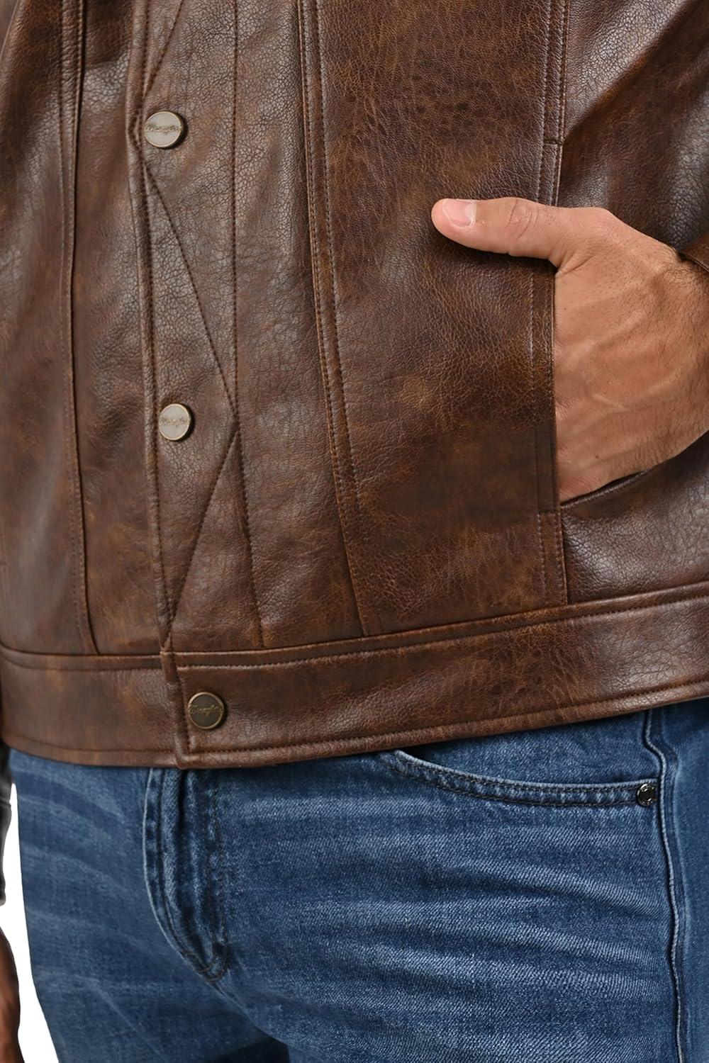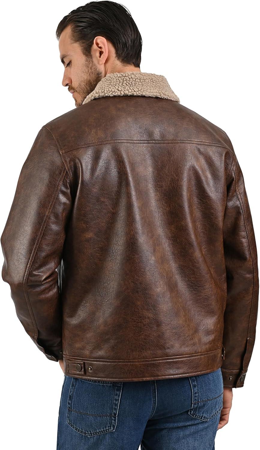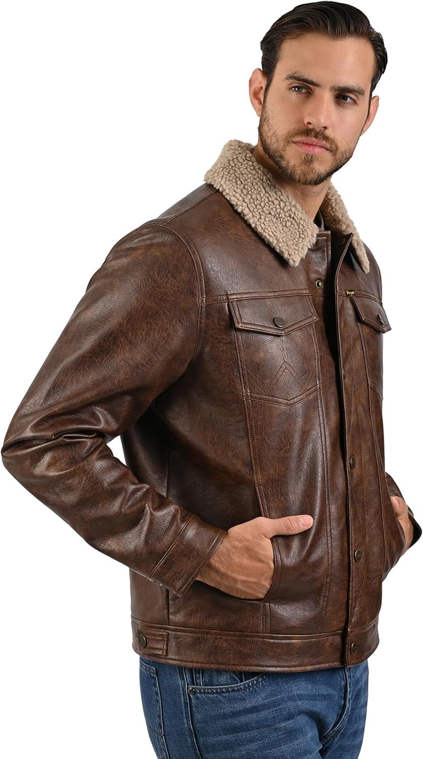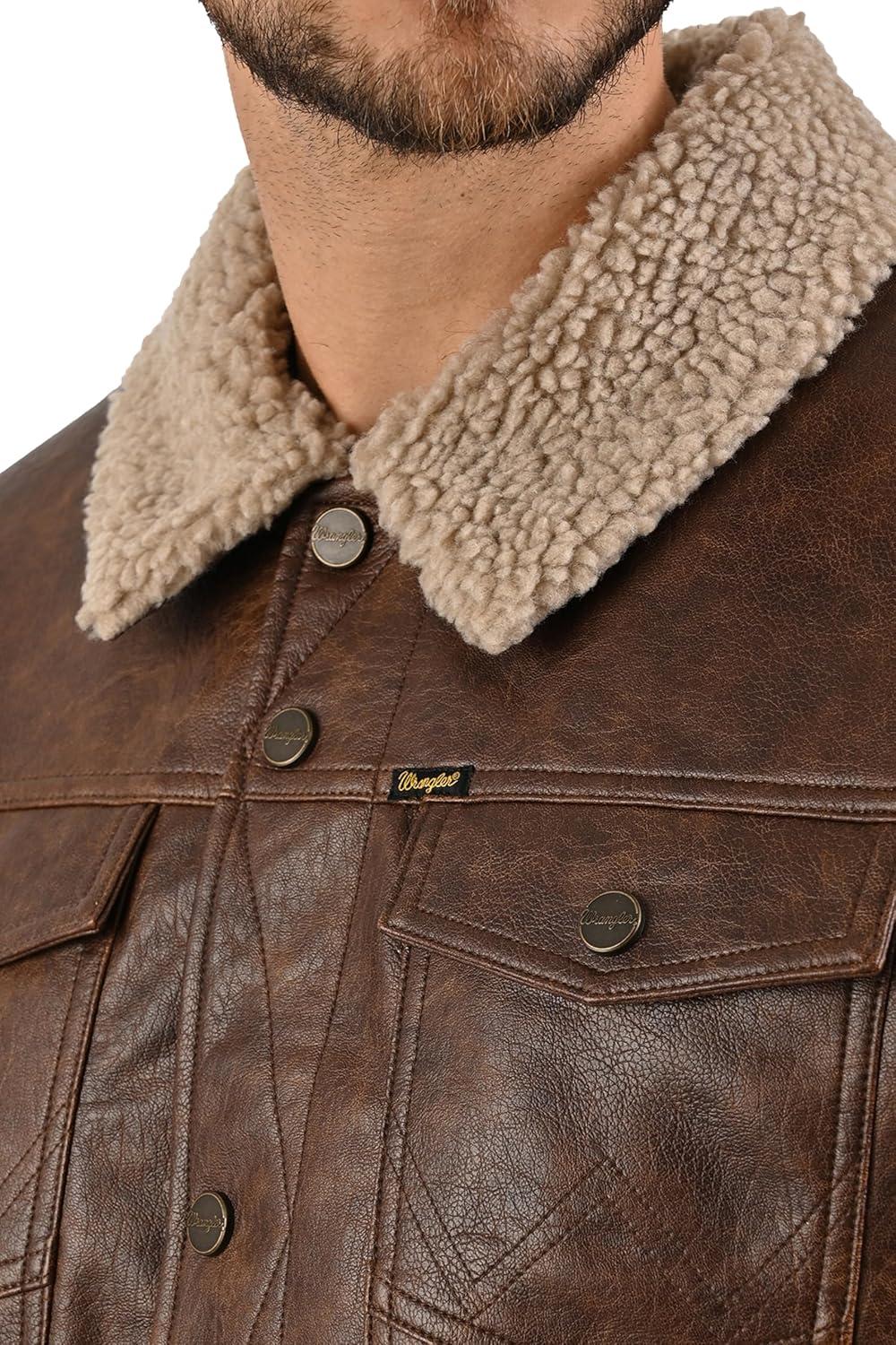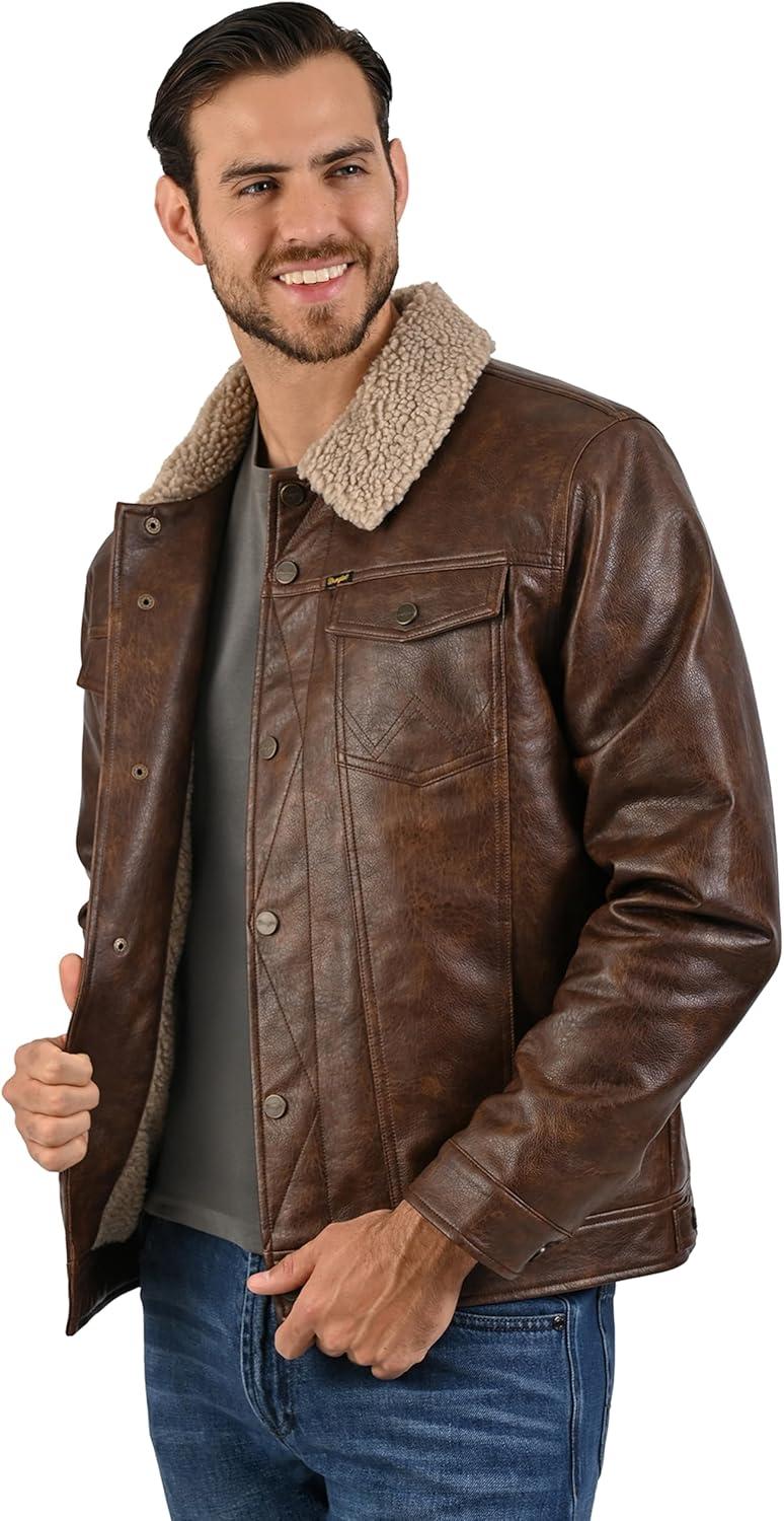 Wrangler Men’s Brown Faux Leather Jacket – Western Trucker Style with Sherpa Collar and Snap Button Closure