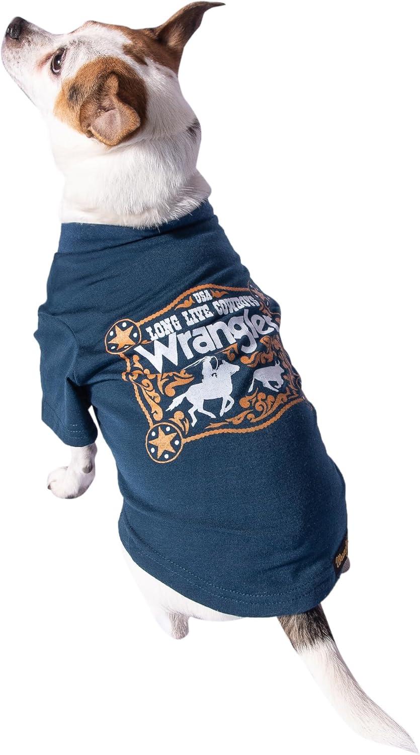 Timeless Iconic Wrangler Logo – Enhance your pup's dog outfit with the timeless Wrangler logo proudly featured on your pet’s dog shirt. Your dog will turn heads wherever they go, rocking authentic Wrangler charm that's made to look great through every adventure and cozy moment