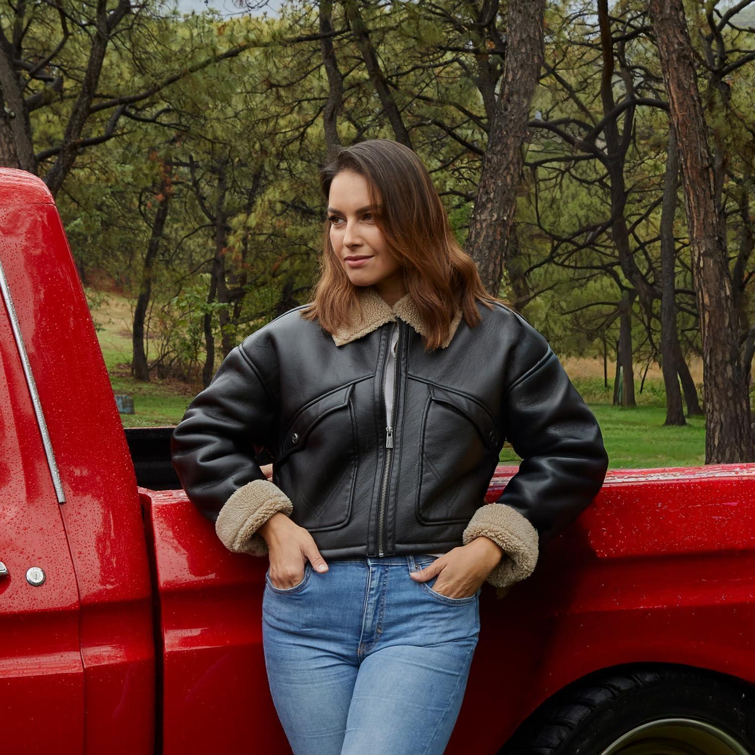 Show off your style with this Wrangler women’s black jacket, crafted from high-quality faux leather with a smooth, durable texture. Inspired by the classic aviator silhouette, it combines a modern, feminine fit with cozy details that add both warmth and character. The sherpa-lined collar and cuffs provide comfort and a soft, inviting touch, while the metal front zipper and functional snap pockets offer practicality and everyday ease. Its structured design delivers a flattering shape, perfect for creating casual or urban looks with a vintage twist. Ideal for chilly days, this jacket blends the authentic Wrangler spirit with a modern aesthetic that never goes out of style.