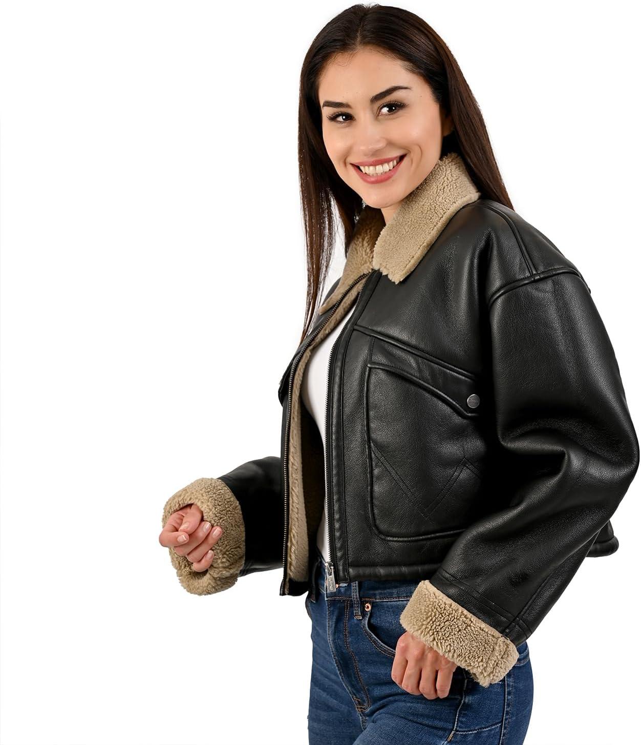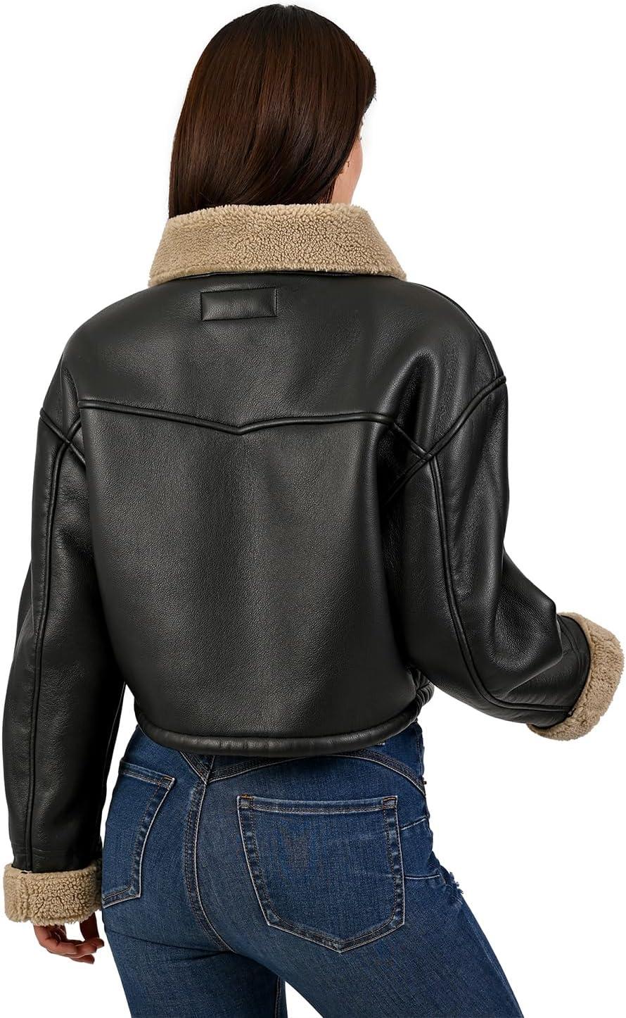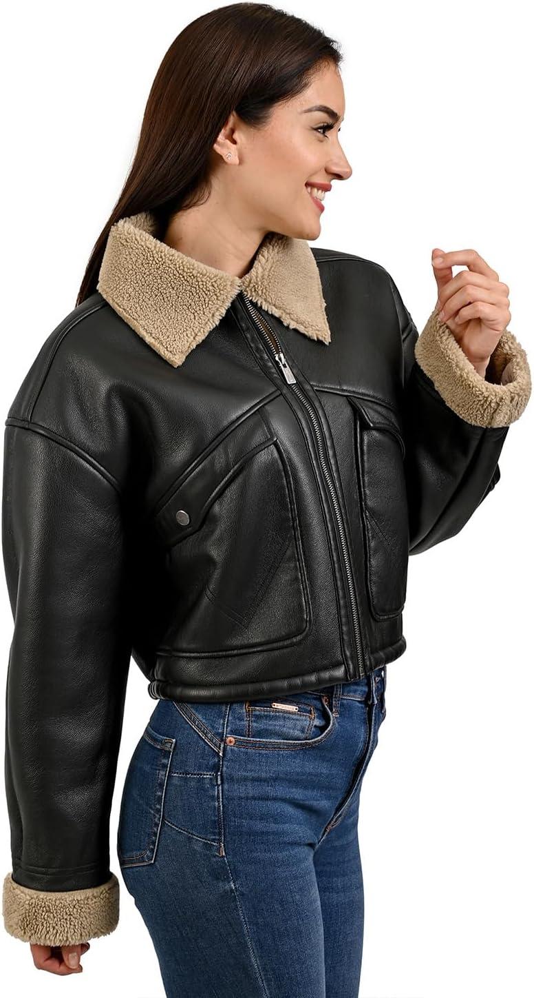 Wrangler Women’s Black Faux Leather Jacket – Sherpa Collar and Cuffs, Warm Lined Aviator Style