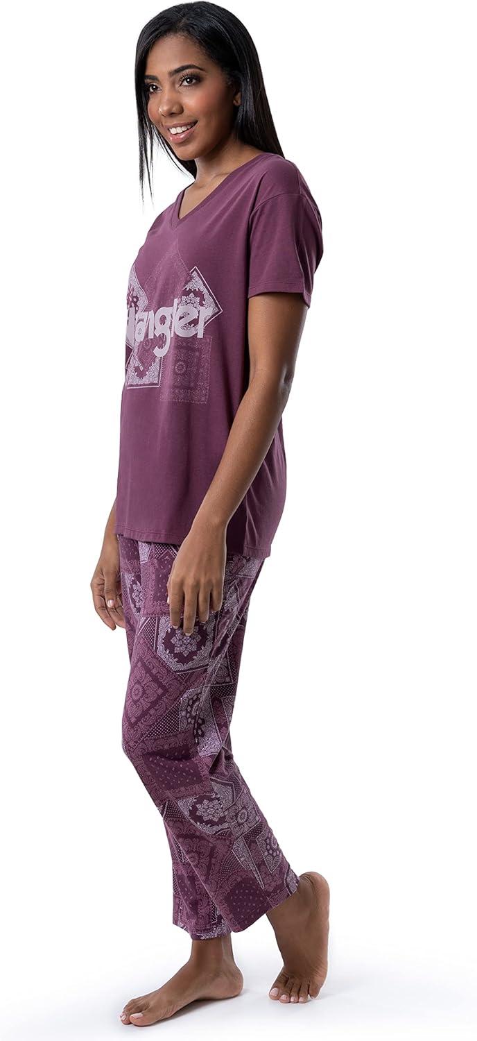 Wrangler Women’s V-Neck Short Sleeve Graphic Tee and Printed Pants Pajama Sleep Set(Amaranth/Paisley)